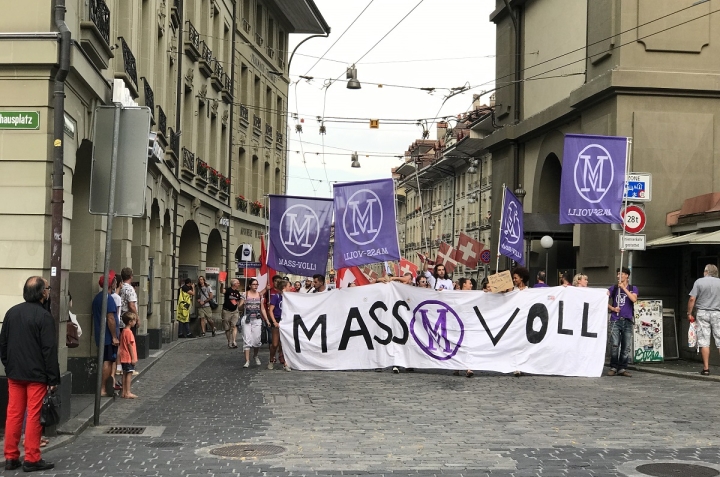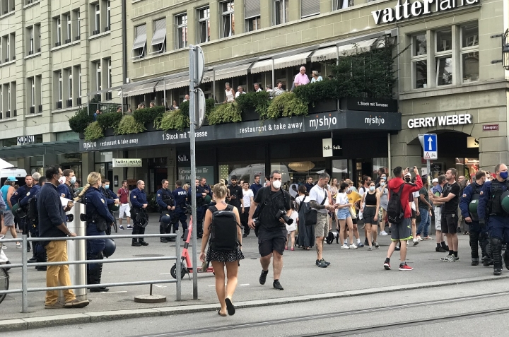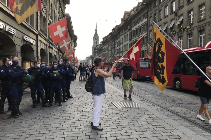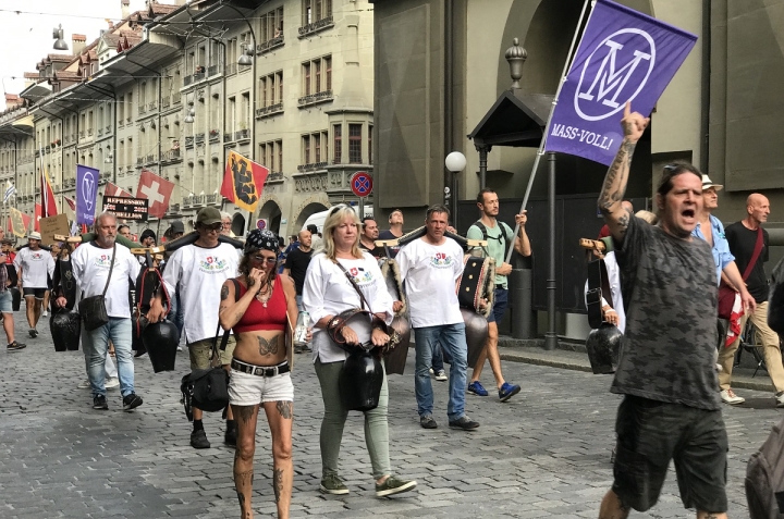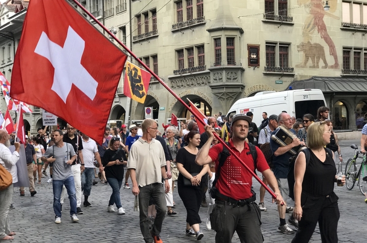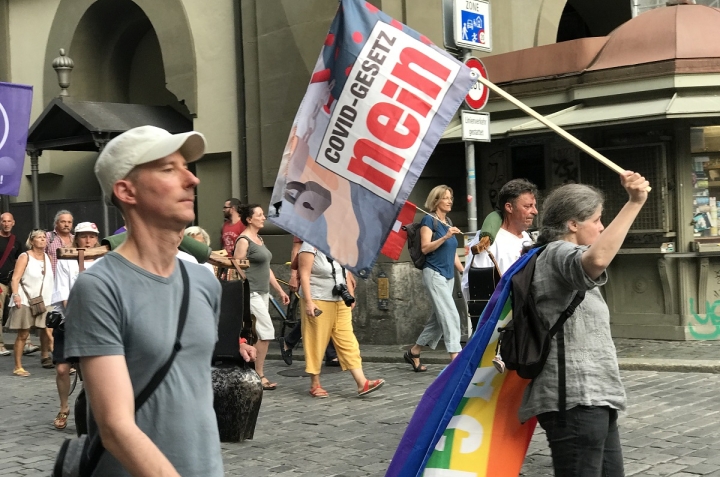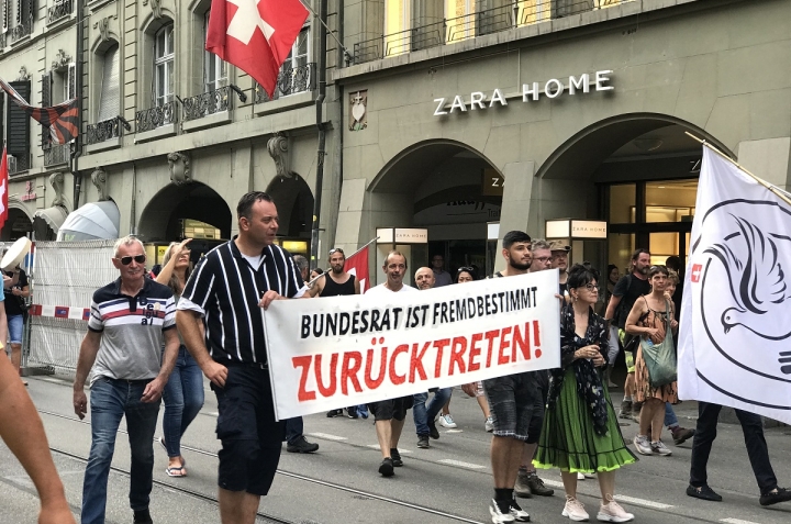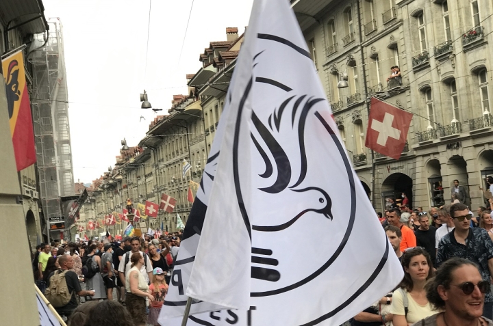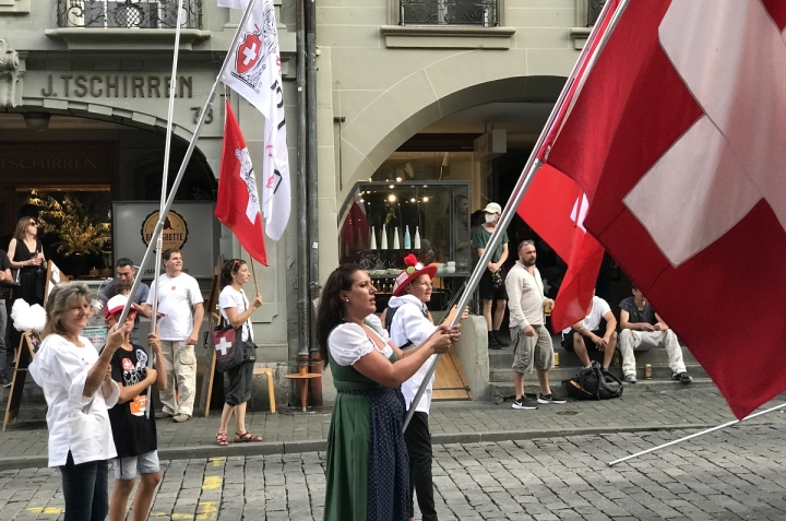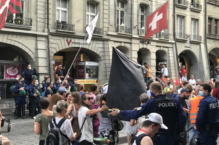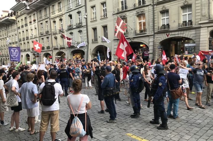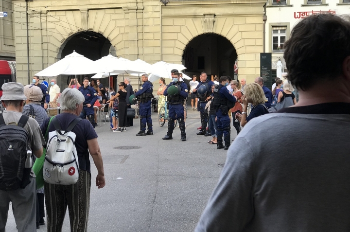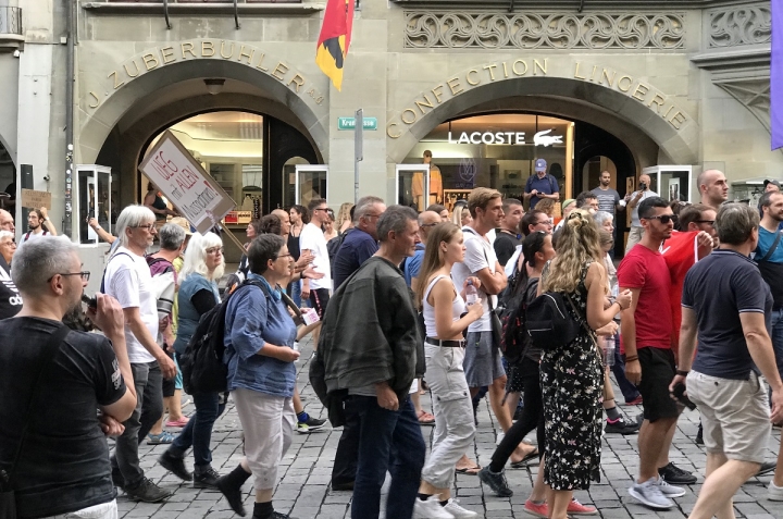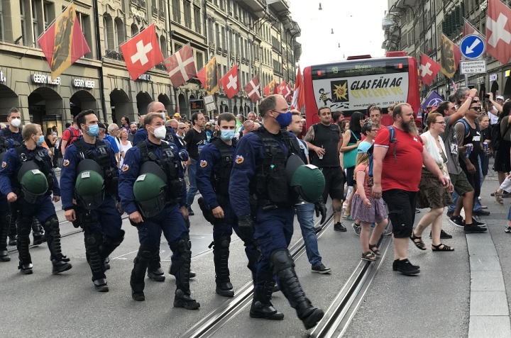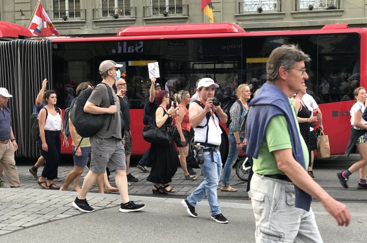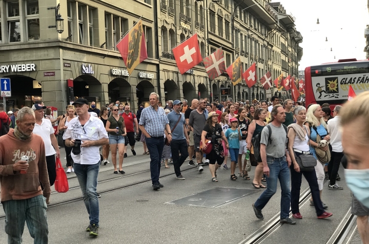 В четверг вечером через центр Берна прошла колонна протестующих против новых планов Федерального совета. Напомним, что швейцарское правительство предложило прекратить финансирование тестов при отсутствии симптомов с 1 октября. Те, кто не сделал прививку или не перенес инфекцию и желает принять участие в мероприятии, где требуется предоставить Covid-сертификат, должны будут сами оплачивать тесты. Некоторые демонстранты держали в руках плакат с надписью: «Федеральный совет должен уйти в отставку». Противники ограничительных мер также не поддерживают закон о Covid-19. В городе было усилено присутствие полиции, площадь перед Федеральным дворцом – перекрыта. Фото: Nashagazeta.ch