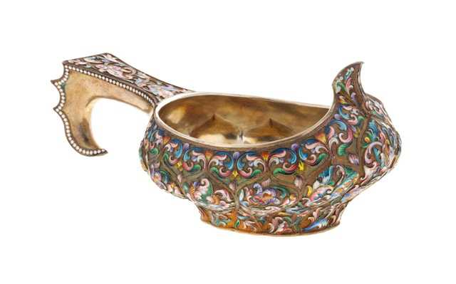Стоит отметить и произведения, выполненные в позолоченном серебре и эмали cloisonné известным мастером Марией Семеновой. Яркий пример - ковш, украшенный типичными  цветочными узорами, благодаря которым она столь известна (лот 234, цена 5 000-8 000).