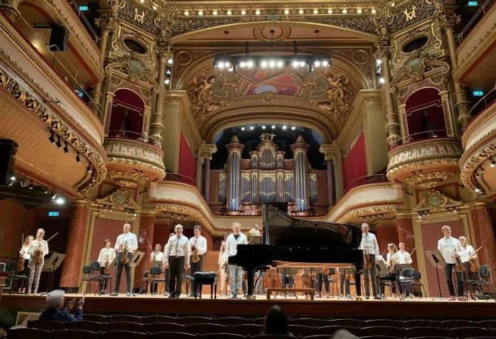 Вопреки традиции, немногочисленные слушатели застали оркестр уже сидящим на сцене – на полагающемся расстоянии, а то и с прастиковыми перегородками - не во фраках и длинных платьях, а по принципу «белый верх, темный низ». В большинстве случаев темным низом были черные джинсы. В джинсах вышел и художественный руководитель оркестра Джонатан Нотт, правда, в серых. «Дирижер в джинсах?» – так и видим мы поднимающиеся в изумлении брови пожилых меломанок с буклями. Да, представьте себе, и контраст между роскошным барочным обрамлением и расслабленным внешним видом музыкантом лишь подчеркивал исключительность момента.