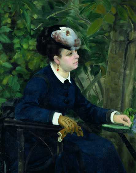 На выставке представлены два портрета Лизы Трео. На первом, «Женщина в саду» 1868 года изображена возлюбленная художника в темно-синем платье за столиком в летнем саду. Глубокий зеленый фон оттеняет ее фигуру. Рука касается небольшого букета летних цветов. Взгляд направлен в сторону от зрителя. Кажется, будто она увлечена какой-то своей мыслью. В этом портрете трудно угадать молодую девушку 20 лет. Но Ренуар никогда не стремился к точному сходству с реальным человеком. Для этого есть фотография. Зато ему удалось передать свое впечатление от любимой женщины. И может, поэтому нам кажется, что и мы, вглядываясь в картину, можем многое рассказать о Лизе Трео, ее характере, привычках, отношениях с самим Ренуаром.