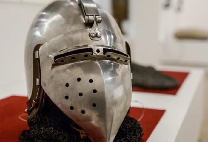 Специально привезенные из других музеев кольчуга, шлем и шпоры – одни из редких полностью сохранившихся до наших дней элементов рыцарских доспехов, которые помогут полнее прочувствовать нарисованную сцену сражения. Заметим, что в XIII-XIV веках стать рыцарем было нелегко, так как претендент должен был купить снаряжение за собственные деньги. К этому надо прибавить цену на поддержание снаряжения в исправном состоянии, покупку новых доспехов вместо отслуживших свой срок, приобретение боевого коня, седла и сбруи, а также наем слуг.