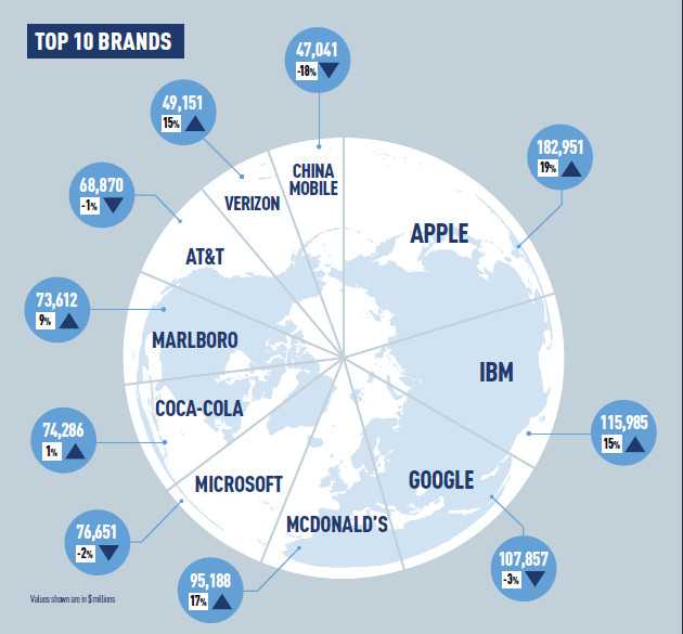 В опубликованном на этой неделе списке 100 самых лучших мировых брендов BrandZ ярко отразились последние изменения в глобальной экономике, хотя в первой десятке и остались почти все прошлогодние игроки. Второй год подряд список возглавляет компания Apple, которая, как бы цинично это не звучало, после смерти Джобса пережила резкий скачок продаж. Хватит ли запала на следующий год, сегодня судить сложно. Потребителям снова обещают новый технологический прорыв, однако неизвестно, как долго бренд сможет приносить сверхвысокие прибыли. Следом за американским «Яблоком» идут его соотечественники IBM, Google, McDonald`s и Microsoft.