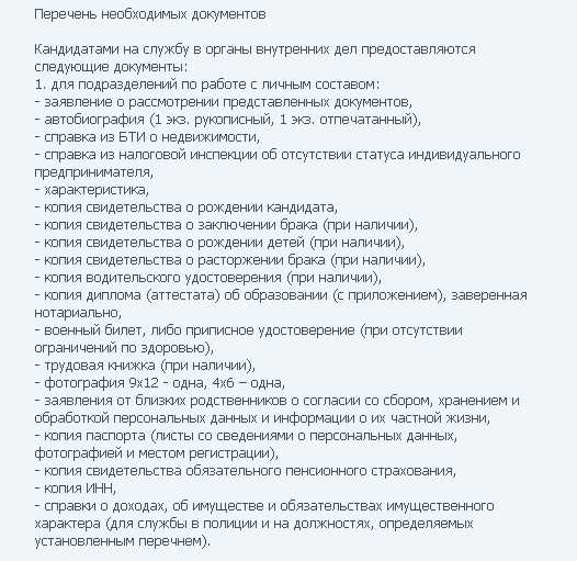 Для того, чтобы стать полицейским в России, теперь также придется пройти более строгие испытания. Среди нововведений - обязательное психологическое тестирование и мониторинг психологического состояние сотрудников. Для того, чтобы поступить на службу, будущий полицейский также, как и его швейцарский коллега, должен соответствовать некоторым формальным критериям. Он должен предоставить обширный пакет документов и справок (см.справа).  Если все справки в порядке, то будущий кандидат направляется на медкомиссию. Но перед тем, как проходить обследование на соответствие по состоянию здоровья, ему также необходимо предоставить набор из 17 бумаг: справок, выписок, копий, анализов и других исследований. И только потом кандидат подвергается психологическому тестированию, медицинскому обследованию и сдает нормативы. И потому кажется удивительным, что, несмотря на столь жесткие требования, многим все же удается с ними справиться и поступить на службу.