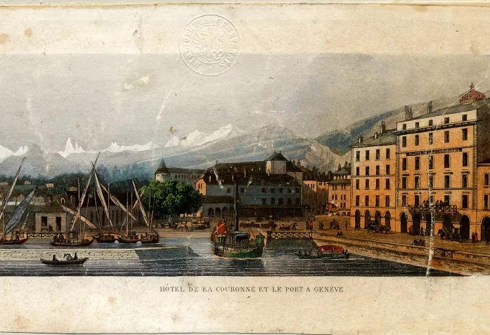Женева. Торговый порт и "Hôtel de la Couronne". Место проведения православных пасхальных богослужений в 1851 году. (notrehistoire.ch)