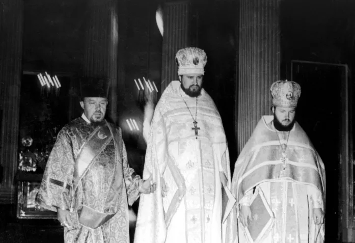 Архимандрит Кирилл (крайний справа) во время архиерейской хиротонии епископа Антония (Завгороднего), 1975 г. Фото: Maxodn via Wikimedia Commons