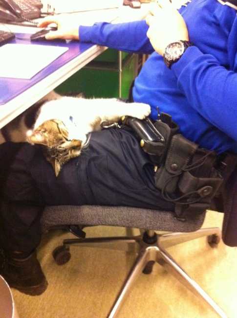 Все эти мирные пушистые картинки сильно поднимают настроение тем, кто их делает. А вот те, кто их смотрит, с интересом отмечают, как выглядит изнутри обстановка, в которой работают швейцарские полицейские. Интересно, разрешается ли публикация фотографий из закрытых для публики учреждений в открытых источниках? Стражам порядка виднее… Впрочем, все равно не удастся прочесть ни строчки из полицейских досье, присутствующих в кадре с кошкой.