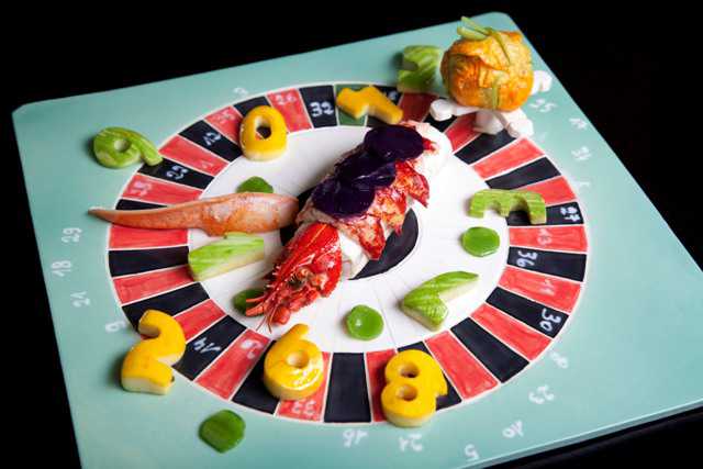 - Расположите на подогретой тарелке цифры из кабачков с каждой стороны, в центр положите сибаса в омаровой коже, а на него – полоски сахарного гороха, чуть смоченные оливковым маслом. Справа положите клешню, а напротив – цветок кабачка