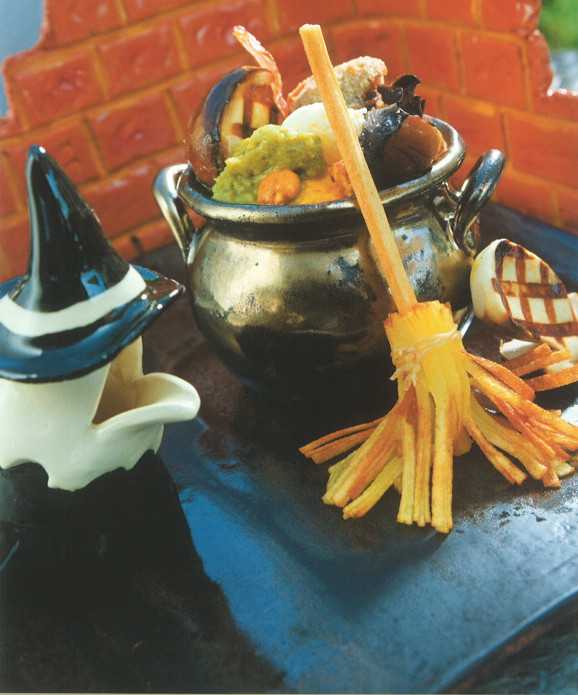 В соуснике подайте горячий бульон. Из хлебной соломки и жареного картофеля сделайте метлу ведьмы. Подавайте их горячими, орошенными уксусом Chardonnay.