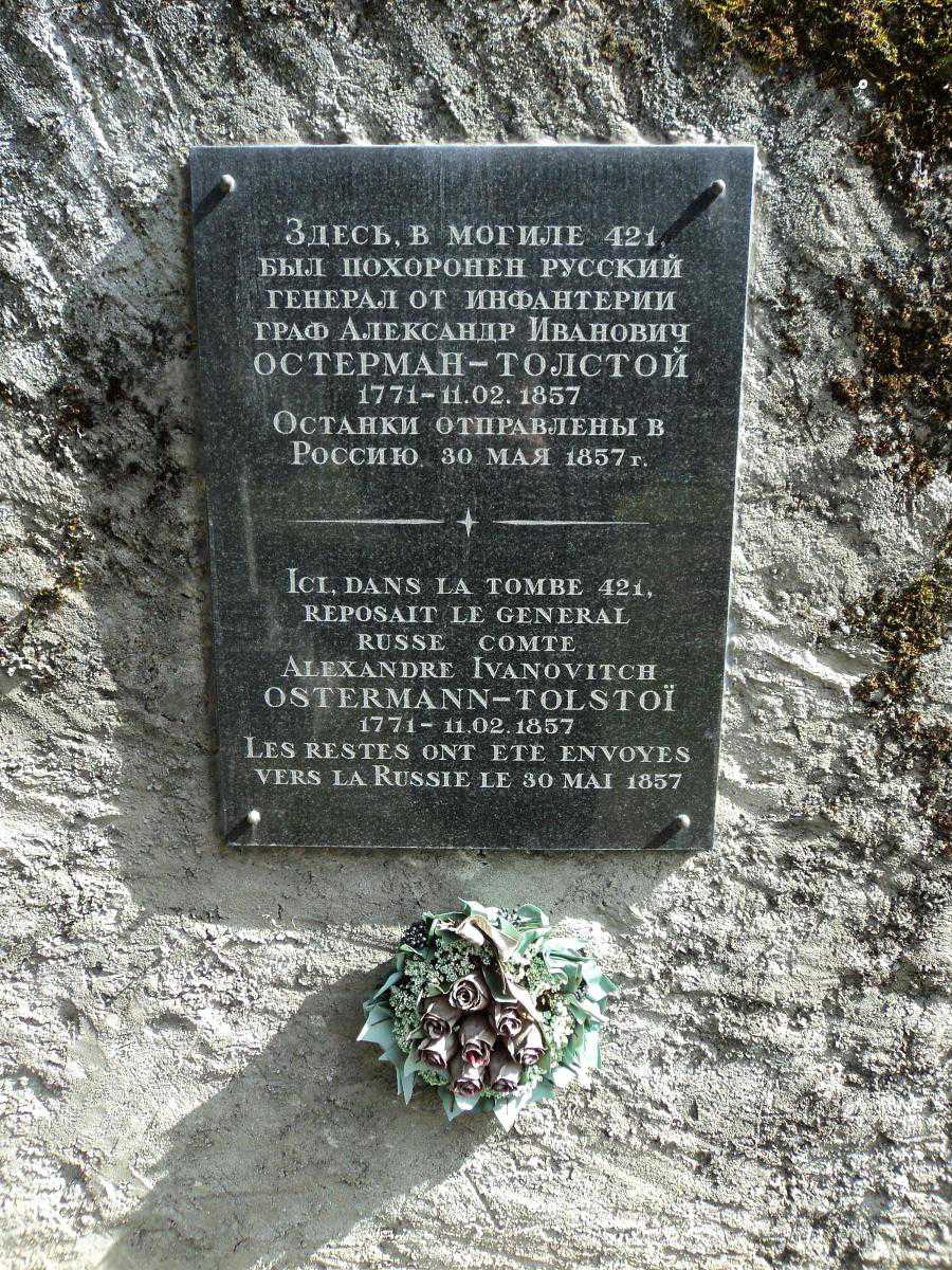 Грядущее двухсотлетие Отечественной войны 1812 года и заграничных походов Русской армии вновь заставляет нас вспомнить о славных событиях и героях того времени. Обратимся же к одной из самых славных фигур эпохи — известному своими подвигами герою-генералу графу Александру Ивановичу Остерману-Толстому, благо повод поговорить о нем весьма удобен. Последние годы своей долгой жизни генерал от инфантерии Остерман-Толстой прожил в Женеве, где скончался и был первоначально погребен.