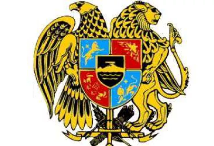 На фото - современный Государственный герб Республики Армения, утвержденный в 1992 году президентом Л.Тер-Петросяном. Меч обозначает готовность бороться за свободу, перо - творческие таланты народа. Сноп - символ святости земли, оливковая ветвь - миролюбие армян. Щитодержатели, орёл и лев, символизируют дух, силу и власть. Лев под крестом изображался на воротах столицы древнего государства Багратидов города Ани (961-1045). Двуглавого орла использовал царский род Мамиконянов. Он же связывался с династией Аршакидов, Тиридатом III. Две птицы и звезда изображались на короне Тиграна II (царство Арташесидов I в.до н.э.). Лев с крестом в лапах помещался на монетах царя Левона II из династии Рубенидов (Киликия XI-XII вв.). Информация с сайта www.heraldicum.ru