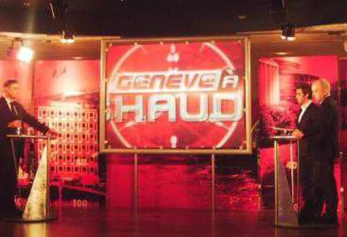 На фото автора слева направо: телеведущий передачи «Genève à chaud» Паскаль Декайе, журналист Лоран Келлер и федеральный советник Ули Маурер.
