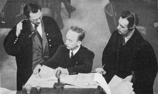Бенджамин Ференц (в центре) на Нюрнбергском процессе, 1947 г.