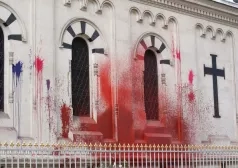 Рано утром в понедельник, 15 октября, Храм Воздвижения Креста Господня подвергся нападению: одну из его стен забросали «бомбами» с краской, а на асфальте написали по-французски слово «убийца».