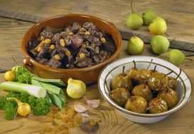 Кусочки мяса для рагу обжарить в масле на раскаленной сковороде. Слить жир. Добавить лук, чеснок, и хорошенько обжарить, затем добавить красного вина, немного воды и оставить на среднем огне томиться в течение часа. Добавить приправы, изюм и тушить еще час. Подавать на стол с картофельным пюре и грушами Ботци.