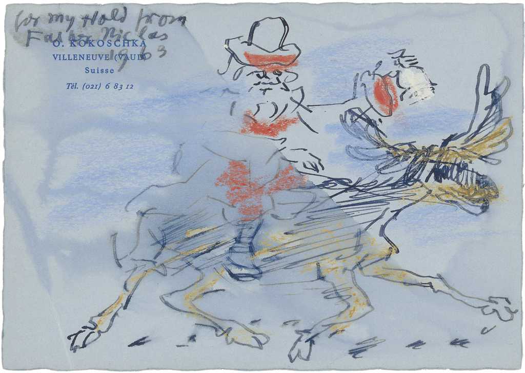 Оскар Кокошка, "Санкт-Николаус на олене", рисунок пером и мелом на голубой бумаге, 1963. Из архива, переданного Ольдой Кокошкой Цюрихской библиотеке (© Fondation Oskar Kokoschka, Musée Jenisch Vevey / 2010, ProLitteris)