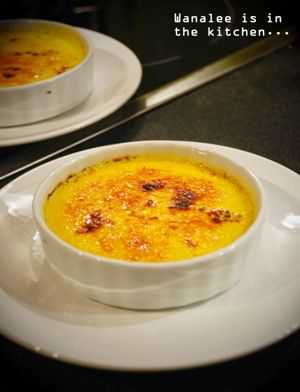 Разогреть духовку до 150 градусов. В кастрюльке подогреть сливки с шафраном и карри. В это время взбить желток с коричневым сахаром. Аккуратно добавить смесь из желтков в крем, чтобы он не свернулся. Выложить крем в формочки для выпекания и поставить их в огнеупорное блюдо. Налить в блюдо воды и готовить крем на водяной бане в духовке в течение 40 минут. Затем поставить в холодильник и охладить в течение одного часа. Перед подачей к столу посыпать сверху сахаром и сделать карамельную корочку с помощью газовой горелки.
