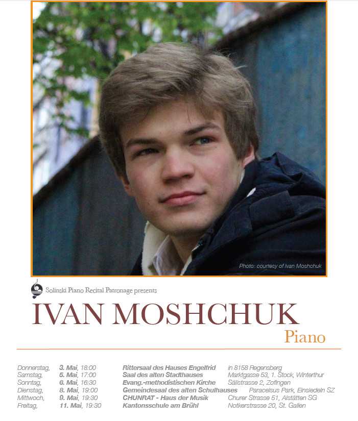 Всегда приятно, когда разные интересные люди, с которыми мы знакомим читателей, дают нам приятные поводы о них напомнить. Вот как раз такой случай. Два года назад, в подробностях рассказывая о Фестивале в Вербье, мы посвятили статью русскоязычным участникам фестивальной Академии. Среди них был и 19-летний тогда пианист Иван Мощук, произведший на нас самое приятное впечатление и своей игрой и, как теперь стало модным говорить, personality. Поэтому мы очень обрадовались, получив от Ивана письмо с сообщением о предстоящих гастролях в Швейцарии.