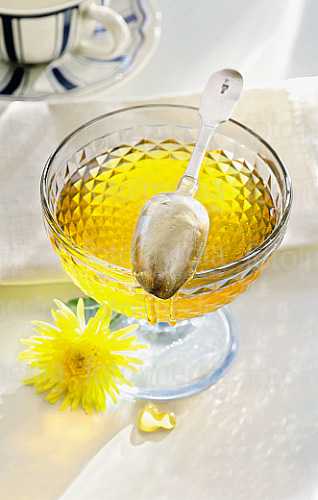 Разобрать цветки одуванчика, отделить желтые лепестки (их будет примерно 50 г), зеленые использовать не нужно (горькие). Кипятить лепестки вместе с натертой лимонной кожурой 7 минут, закрыть и оставить не менее чем на 12 часов. Получившуюся жидкость процедить и перелить в кастрюли – в результате получится примерно 3 dl. Добавить сюда лимонный сок и сахар и варить до получения густого сиропа. Перелить его в заранее нагретые прозрачные банки и сразу их закрыть. В темном прохладном месте мед из одуванчиков хранится до 8 месяцев. Совет: автор рецепта советует не гнаться за количеством и не делать порцию меда больше, чем из 5 dl воды, потому что иначе мед может стать слишком жидким или закристаллизуется.