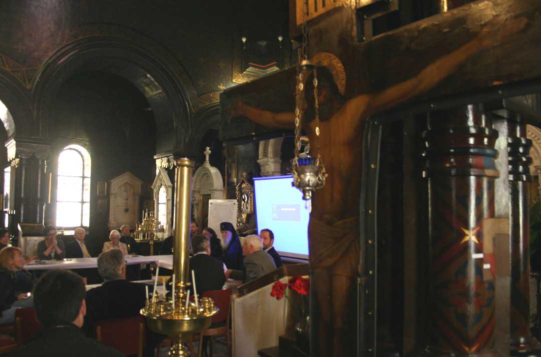 Собор стоит затянутым в серые строительные леса. Золоченные купола и кресты стали почти незаметны, отчего полностью изменился облик всего престижного района, в котором расположена церковь. «Прежде чем перейти к подробному рассказу о судебных тяжбах, тормозящих реставрационный процесс, я бы хотел показать несколько исторических фотографий. На них видно, что в конце 19-го века рядом с собором еще не было никаких зданий. Дома здесь появились позже, при этом их расположение планировалось так, чтобы церковь оставалась центром всего квартала», - так начал встречу Франсуа Мозер, глава Общества Русской церкви Женевы.