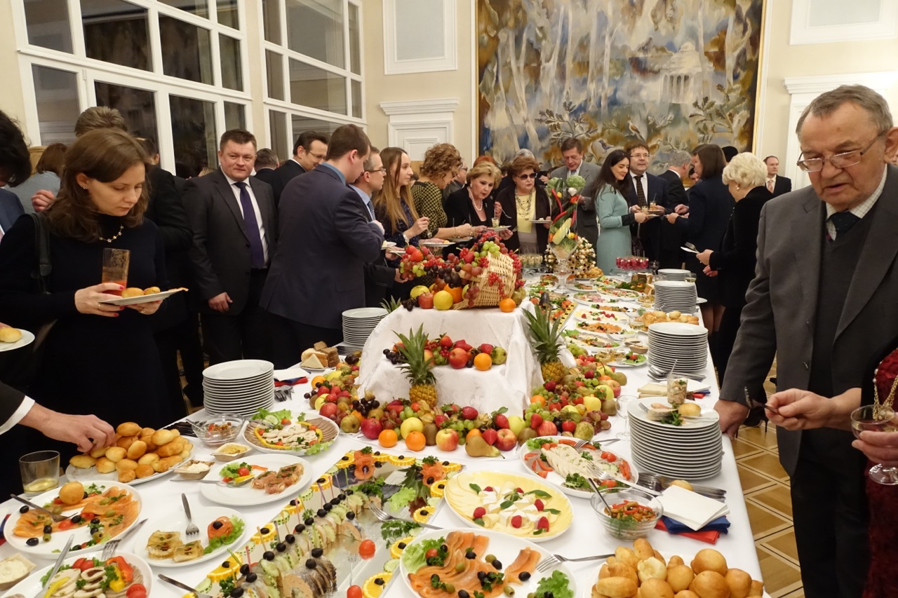 Вчера в банкетном зале Российского представительства поздравить друг друга с праздником, пообщаться и закусить собралось много народа. По имеющимся у нас данным, российских дипломатов в Швейцарии - около двухсот, сотрудники международных организаций "не считаются", у них особый статус - международные чиновники. К ним присоединились и различные представители общественности, к дипломатии отношения не имеющие, но на приемах в постпредстве бывающие регулярно.