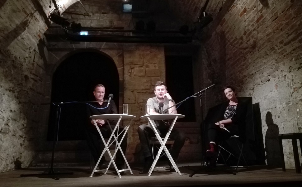 Актер Томас Дуглас, писатель Дмитрий Глуховский и модератор Конни Брюггер в культурном центре Ono © Nashagazeta