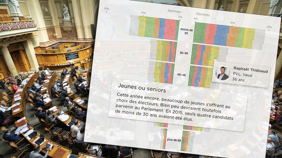 Женщин-кандидатов на этот раз рекордно много – 1858. Больше всего дам – в Партии зеленых (56%) и Социалистической партии (PS, 51%), меньше всего – в Консервативно-демократической (PBD, 31%) и Народной партии Швейцарии (НПШ, 22%). В этом году Федеральный дворец буквально атакуют молодые политики, самая большая группа – мужчины и женщины моложе 30 лет (есть даже 19-летние). Впрочем, маловероятно, что многим из них улыбнется удача – в 2015 году, например, были избраны всего четыре кандидата из этой возрастной категории. Меньшинство среди желающих войти в парламент составляют люди в возрасте 60-69 лет.