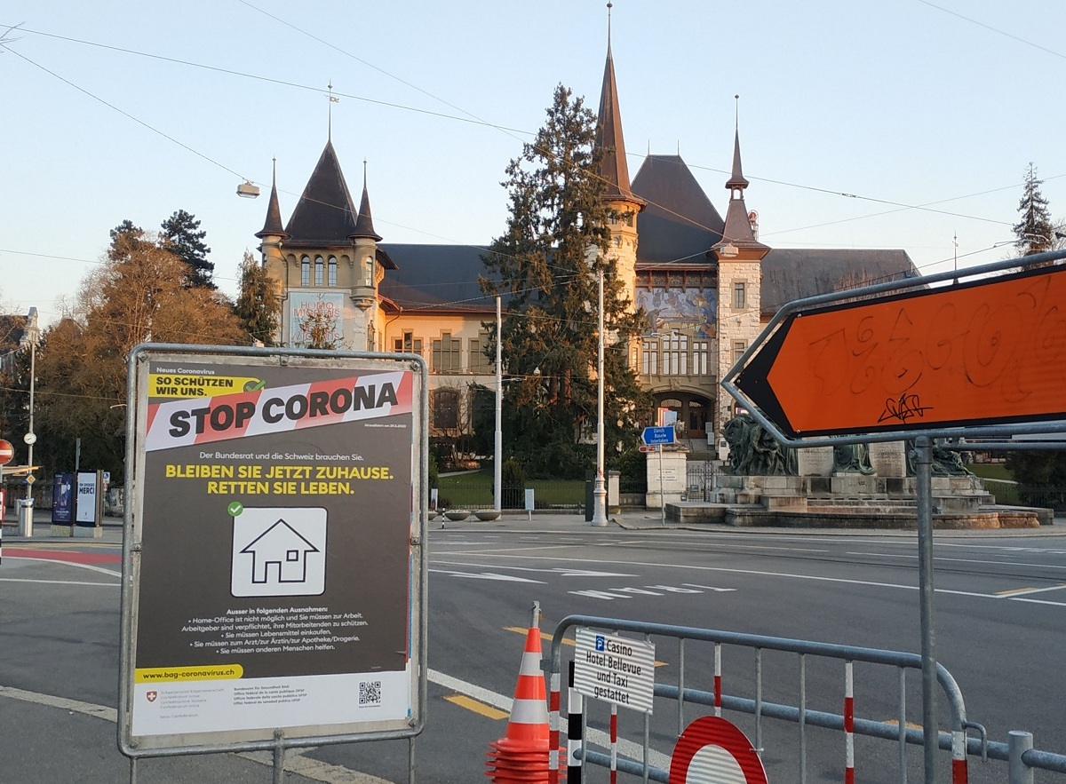 «Stop Corona. Оставайтесь дома. Спасайте жизни» - плакат с таким призывом расположен на одной из площадей Берна. Фото: Nashagazeta.ch