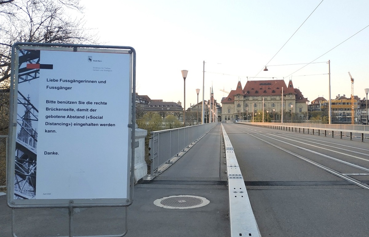 Бернских пешеходов просят переходить мосты по определенной стороне, чтобы гарантировать соблюдение «социальной дистанции». Фото: Nashagazeta.ch