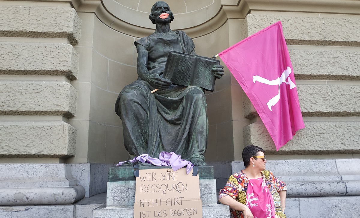 Демонстрантка у здания Федерального дворца в Берне, 14.06.2019. Фото: NashaGazeta
