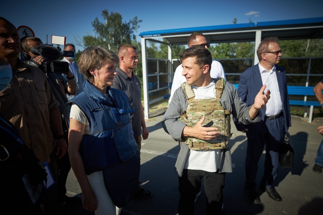 Главы двух стран провели встречи с представителями международных организаций, включая Организацию по безопасности и сотрудничеству в Европе (ОБСЕ), Международный комитет Красного Креста и ООН, а также посетили контрольный пункт въезда/выезда (КПВВ) «Станица Луганская». По словам Соммаруги, линия разграничения разделяет семьи и друзей, но в то же время пять пунктов пропуска, которыми ежемесячно пользуются миллион человек, являются «местами надежды».