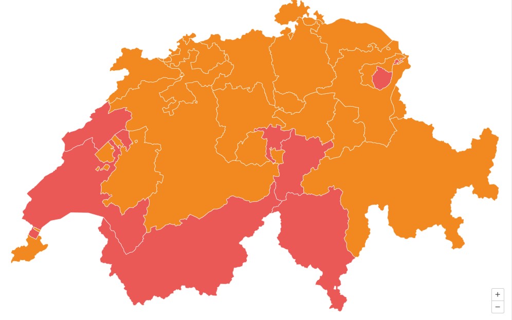 Красным цветом выделены кантоны, в которых R-значение превышает 1 © Covid19.admin.ch