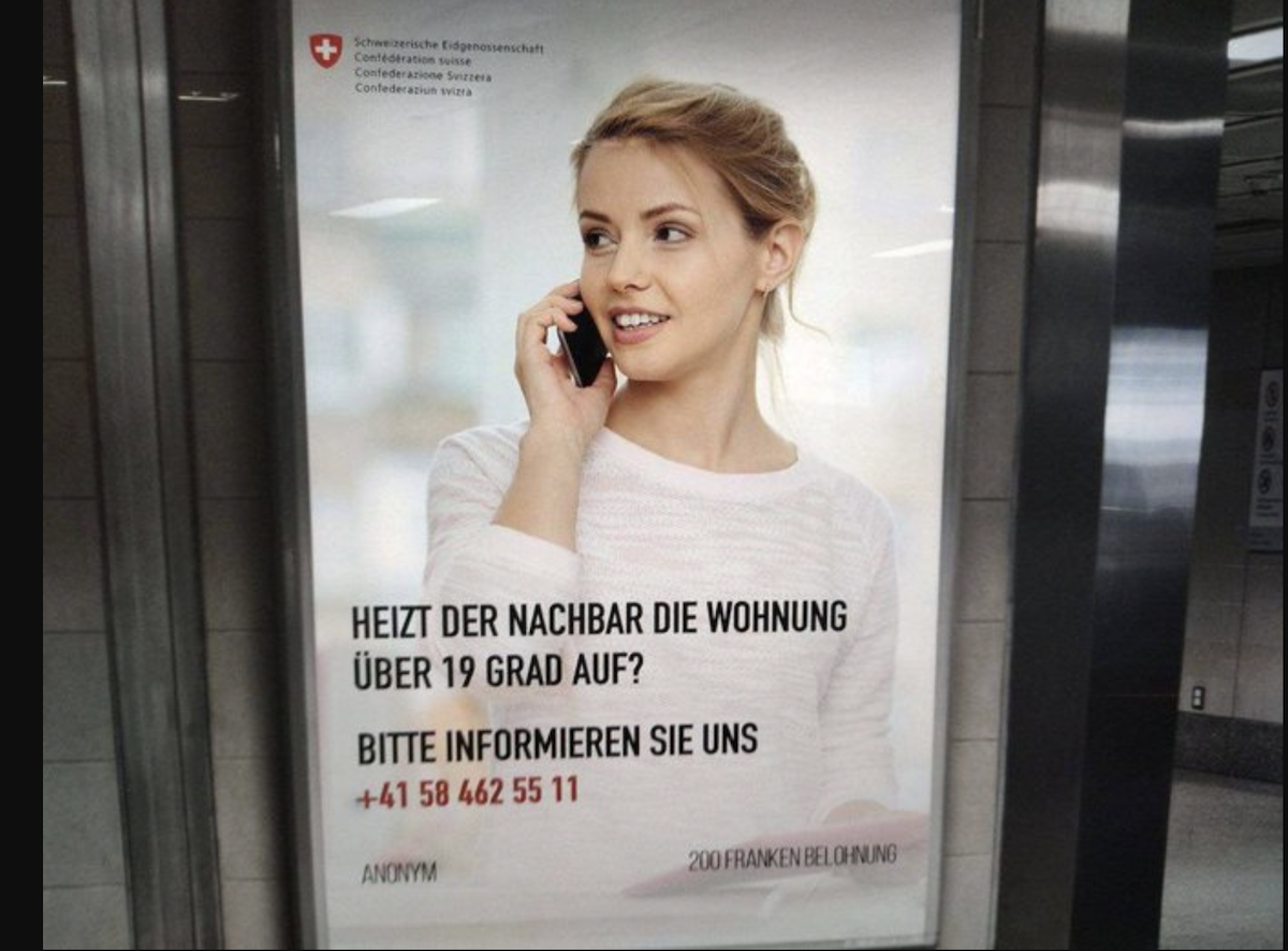 В социальных сетях появился фальшивый плакат, якобы от имени властей призывающий швейцарцев доносить на соседей, которые отапливают квартиру ваше 19 градусов. Кто за этим стоит?