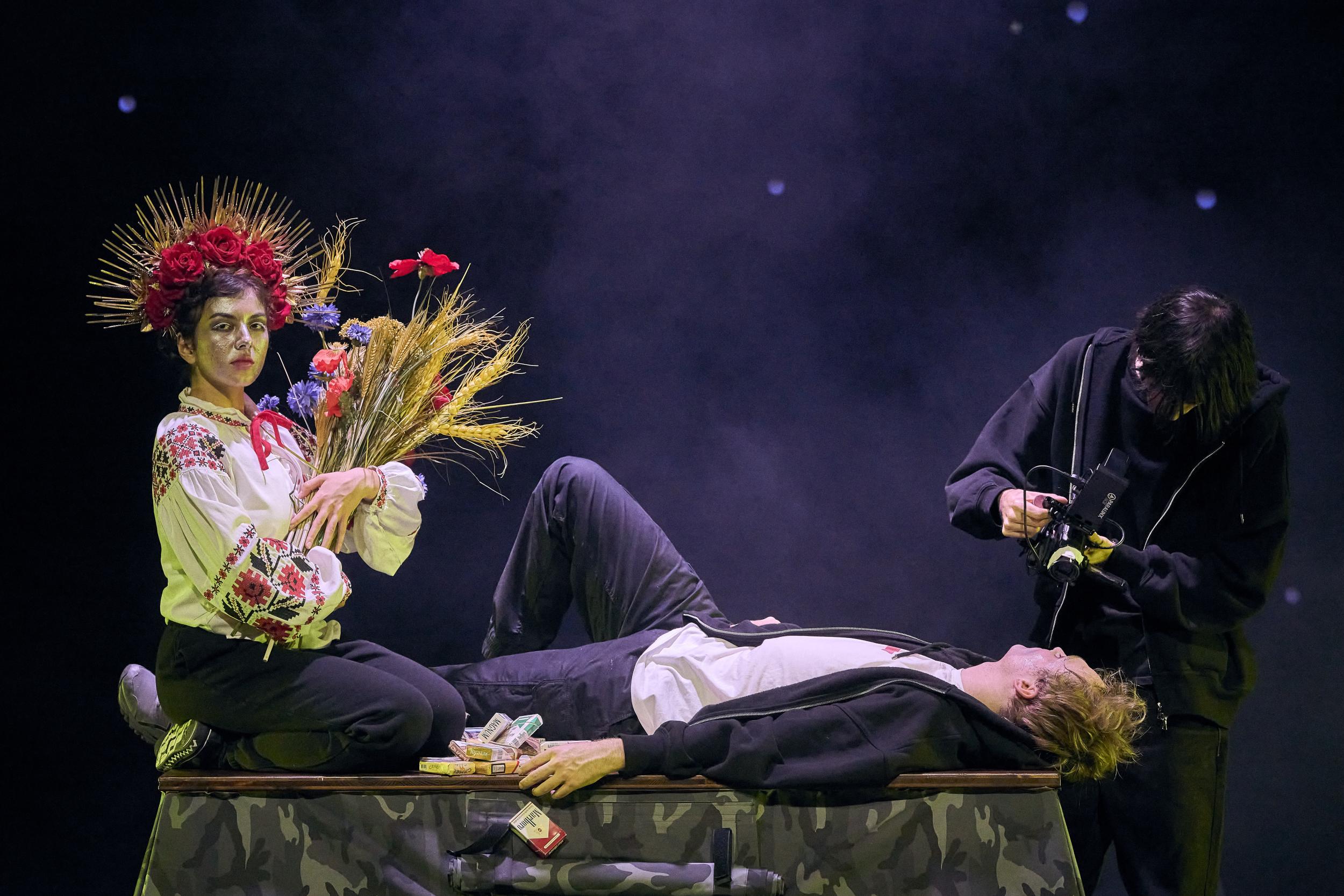 Этот контраст между нелепостью происходящего и его обыденностью подчеркнут всей абсурдистской, - «сюрреалистичной», как говорит Матвий, - постановкой (режиссер Петер Кастенмюллер). И если животных обозначают обычные обувные коробки с торчащими из них разноцветными перьями, то войну – агрессивные компьютерные игры, в которые «режутся» оба исполнителя роли Матвия. На сцене присутствуют и огромный надувной «член», очевидно символизирующий вечно матерящихся российских солдат, и стол «в камуфляже», под которым горожане прячутся во время бомбежек, и ворох одежды, в которую облачается главный герой, решивший наконец уехать в Европу, которую перед этим смачно ругал («Германия? Там слишком много русских», - к вящему восторгу публики замечает он), и даже цветок по имени Степан.