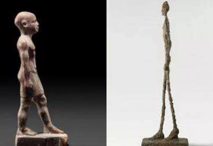 Джакометти открыл для себя Древний Египет во время путешествия по Италии в 1920 году. Из Рима он писал родителям: «Самая красивая скульптура для меня – не греческая и не римская, и уж точно не скульптура Ренессанса, а Египта» (февраль 1921г.). В древнеегипетском искусстве его поражали чистота линий и лаконичная выразительность жестов, необыкновенно поэтичная абстракция рисунка, глубоко символичного и в то же время реалистичного. Лаконичность форм «не без изящества, но без лишних деталей», - замечал французский археолог Франсуа Ленорман о египетской скульптуре, – «прямые линии, величественные застывшие позы, ноги параллельные, часто слитые в единое целое. Стопы ног касаются друг друга или, если одна нога впереди другой, указывают в одном направлении, но всегда остаются параллельными. Руки словно подвешены к телу...».