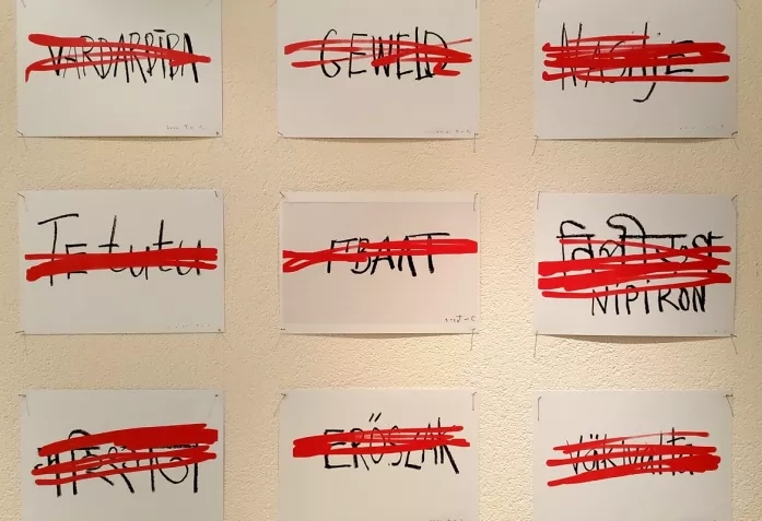 Еще одна знаковая работа создана художницей Антониной Слободчиковой и представляет собой листы бумаги, на каждом из которых красным цветом зачеркнуто написанное на разных языках слово «насилие». Белорусский, русский, азербайджанский, французский, немецкий, грузинский, армянский, шведский, бенгальский, маори – язык насилия и сопротивления ему известен во всем мире. Напомним, что именно Слободчикова придумала символы «женского триумвирата», ставшие потом символами белорусских протестов в целом – сердечко, сжатый кулак и знак победы.