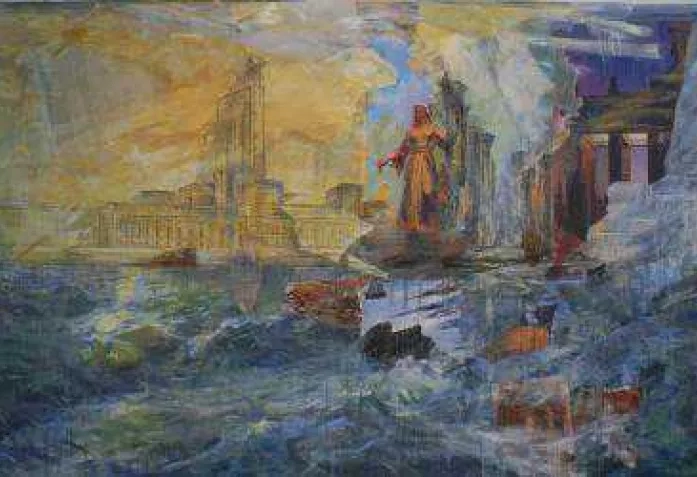 А внутри очень интересно. Полотна Валерия Кошлякова, которого специалисты называют одним из важнейших художников его поколения, поражают своей монументальностью – и по размеру, и по содержанию, некоей «архитектурностью» композиции, в которой прошлое соседствует с современностью, и почти физически осязаемой ностальгией.