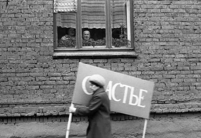 Владимир Соколаев. Женщина, спешащая на первомайскую демонстрацию. Улица Обнорского. Новокузнецк. 1.05.1983