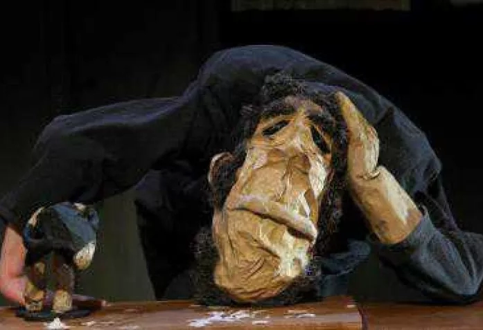 Каким видится Башмачкин постановщику спектаклю Сержу Булье? По задумке французского режиссера (спектакль – копродукция с труппой Bouffou Théâtre à la Coque d’Hennebont) действие происходит в чем-то вроде платяного шкафа с двойным дном, шкафа, находящегося в заводской раздевалке, с которой г-н Булье сравнивает сегодняшний мир. В этом шкафу актеры в масках и без масок смешиваются с меняющими размер куклами, а аккордеонист, сопровождающий спектакль, кажется, танцует с таинственными тенями.