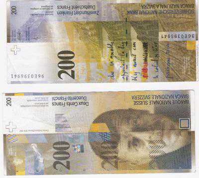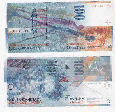 Ну, а современные швейцарские банкноты 8-й серии выпуска (в которой билет номиналом 1000 франков заменил 500-франковую купюру) имеют каждая свой размер и цветовую гамму: на 10-франковой купюре (размер 126 x 74 мм, желтый фон) изображен известный архитектор, художник и декоратор швейцарского происхождения Ле Корбюзье (1887-1965); 20-франковая купюра (размер 137 x 74 мм, красный фон) посвящена швейцарскому композитору Артюру Онеггеру (1892-1955), позднее работавшему во Франции; 50 франков (размер 148 x 74 мм) выполнены в зеленой цветовой гамме, на фоне которой красуется поэтичный образ единственной женщины в этой денежной коллекции - Софи Тойбер-Арп (1889-1945), представительницы дадаизма и абстракционизма в живописи; портрет швейцарского скульптора и художника Альберто Джакометти (1901-1966) помещен на банкноту достоинством в 100 франков (размер 159 x 74 мм, голубой фон); купюры наивысшего номинала – 200 и 1000 франков посвящены истории и литературе: швейцарский франкоязычный писатель Шарль Фердинанд Рамю (1878-1947) украшает своим изображением 200-франковую банкноту (размер 170 x 74 мм, коричневый фон), а на 1000-франковой купюре (размер 181 x 74 мм, фиолетовый фон) изображен Якоб Буркхардт (1818-1897), швейцарский историк и философ культуры.