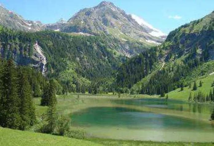 Вы можете доехать до автостоянки (на фото), откуда начинается полуторачасовой пешеходный маршрут вокруг озера. Само же озеро, как жемчужина в оправе горных хребтов, сравнительно небольшого размера и по местным меркам довольно мелкое. Но его привлекательность не в размерах и глубине! Непередаваемая игра оттенков в окраске воды, меняющаяся по мере вашего приближения к озеру или удаления от него - от нежно-салатового до глубоко-бирюзового. Впечатляет и вид, открывающийся с одной из «точек» пешеходного маршрута на лежащий далеко внизу городок Лауэн. Трудно оторвать взгляд от горного водопада, который издалека кажется нарисованным на серо-зеленом фоне скал.