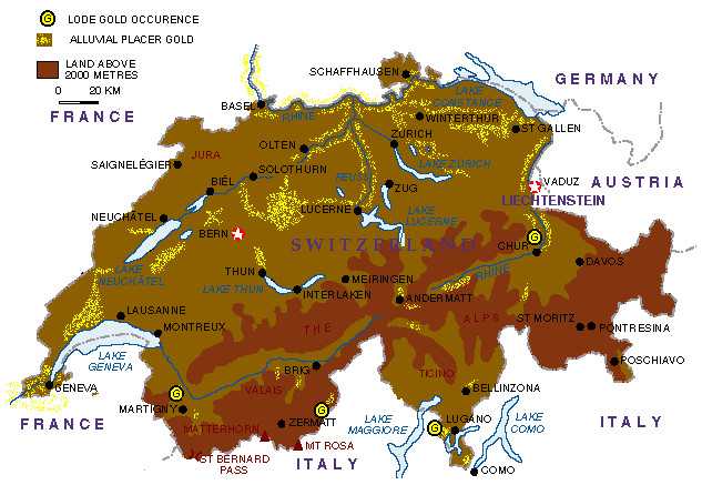 Карта золотых месторождений Швейцарии с сайта золотоискателей-любителей goldwaschen.ch