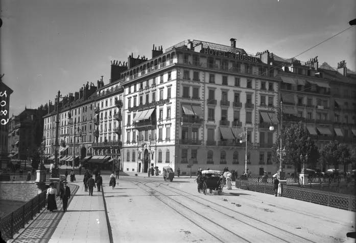 Если глядеть на правый берег озера и Роны с моста Мон-Блан или с рейда, то в череде величественных домов – в основном, гостиниц, - сооруженных в разгар строительного бума середины XIX века, замечаешь один-единственный «вставной зуб», коробку 70-х годов века ХХ-го. Расположена эта коробка чуть ли не на самом видном месте, на углу одноимённых улицы и набережной Мон-Блан, напротив роскошного отеля «Берг». Даже не будучи знатоком архитектуры, понимаешь, что тут что-то не так, и не могли во второй половине ХХ века, в центре плотно застроенной Женевы воздвигнуть здание на каком-то пустыре. Тут что-то находилось раньше...