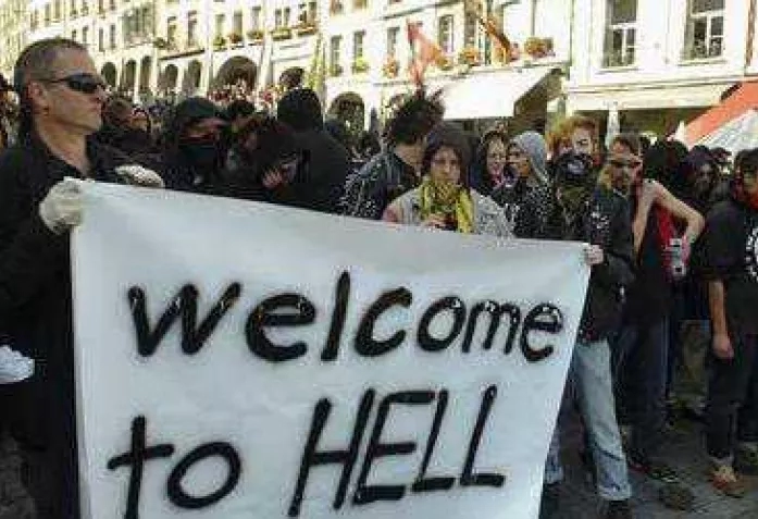 Так вспоминает о выступлениях антиглобалистов 2003 года, перед собранием стран «Большой Восьмерки» в Эвиане, один из моих швейцарских знакомых. Тогда французские власти, благоразумно подумав о безопасности политических лидеров, перекрыли подступы к городу, и манифестанты «выступили» в Женеве. А здесь можно посмотреть любительское видео, сделанное во время тех же событий в Лозанне. Обратите внимание, что интервью с одетыми в черное и носящими маски демонстрантами проходят на немецком языке - это представители так называемого «Черного блока». Они приезжают на все подобные акции из немецкой Швейцарии, а также Германии, Австрии и Италии. Во франкоязычной части страны такого не водится.