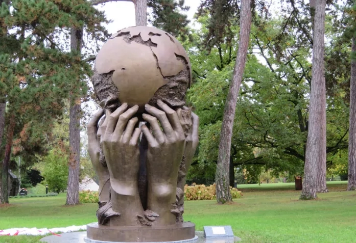 Господин Гасанов в свою очередь поблагодарил М. Моллера и его коллег за эффективное сотрудничество и, в частности, за помощь в организации торжественной церемонии. Предваряя символический момент перерезания ленточки, он сказал, что привезенная в Женеву из Баку скульптура – земной шар, поддерживаемый поднятыми вверх, словно обращенными в будущее, руками – призвана отразить чаяния всего человечества, связанные с миром, безопасностью, развитием и правами человека. Реализация этих чаяний – важнейшая задача Организации Объединенных Наций.
