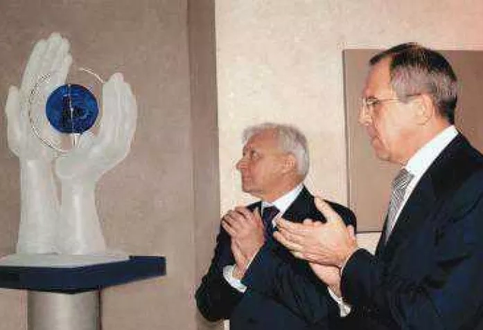 Министр иностранных дел РФ С.В. Лавров и постоянный представитель РФ в ООН (Женева) В.В. Лощинин рассматривают подарок.