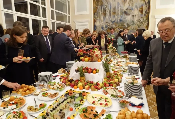 Вчера в банкетном зале Российского представительства поздравить друг друга с праздником, пообщаться и закусить собралось много народа. По имеющимся у нас данным, российских дипломатов в Швейцарии - около двухсот, сотрудники международных организаций "не считаются", у них особый статус - международные чиновники. К ним присоединились и различные представители общественности, к дипломатии отношения не имеющие, но на приемах в постпредстве бывающие регулярно.