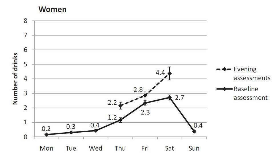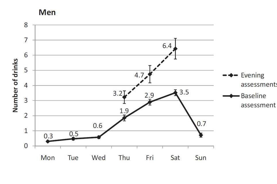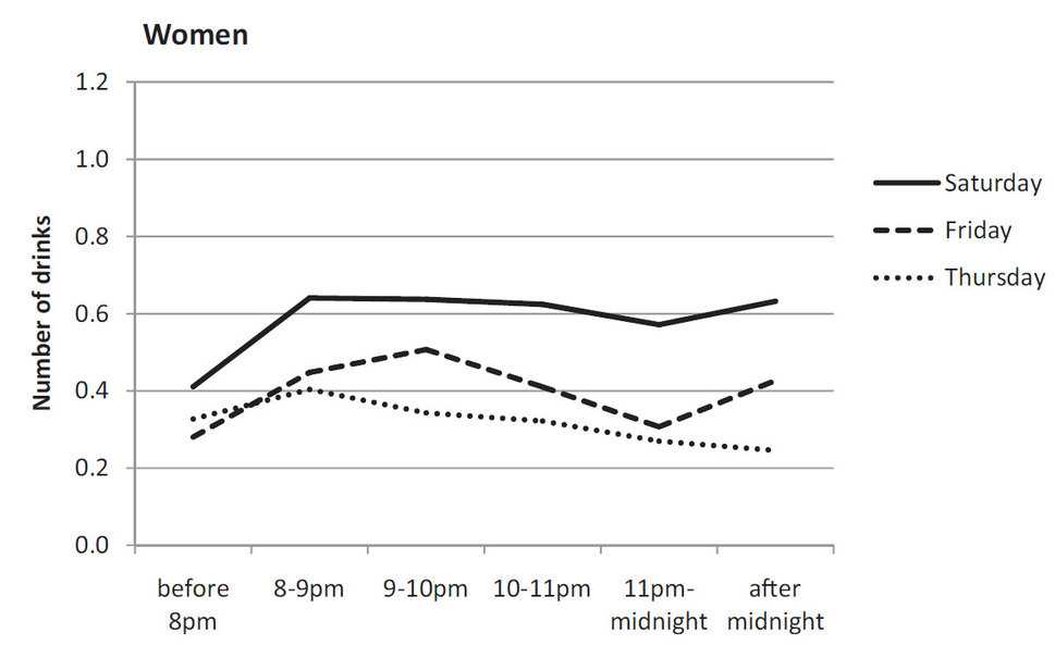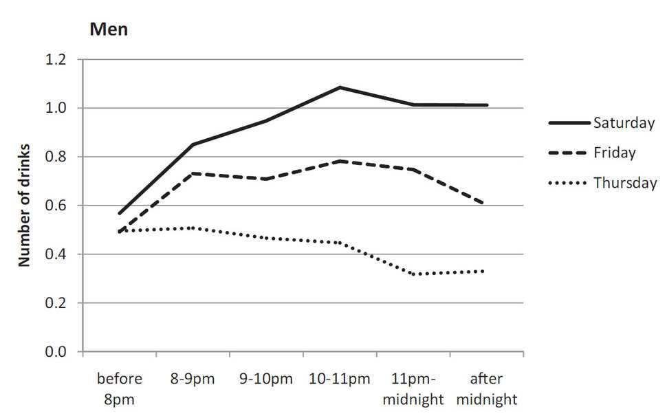 Графики взяты из работы: Kuntsche, E., Labhart, F., Investigating the drinking patterns of young people over the course of the evening at weekends. Drug Alcohol Depend. (2012).