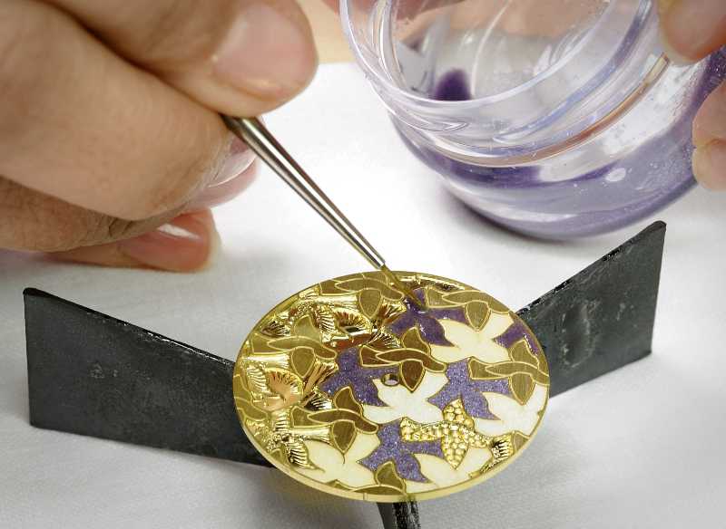 Вначале над циферблатом работает гравер, нанося на него рисунки в стиле Арт Нуво по мотивам работ датского художника Мориса Корнелиса Эшера. Затем будущие часы переходят в руки эмалировщика, а чаще - эмалировщицы. Тончайшей кисточкой она заполняет эмалью выгравированное пространство. Этап этот опасный: при термической обработке эмаль может изменить форму, и тогда вся заготовка восстановлению не подлежит…
