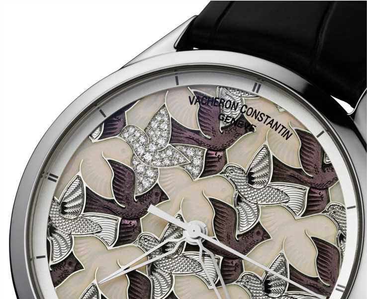 Циферблат часов серии Métiers d’Art под названием Dove украшен изображениями голубков – матово-белых, фиолетовых (эмаль) и металлических (гильошированное золото), одна из птичек инкрустирована 38 бриллиантами. Впервые часы такого дизайна появились в прошлом сентябре, в единственном экземпляре на благотворительных торгах Only Watch в Монако. Сейчас к «небесным» часам добавились еще две модели – «морские». Fish - выполнена в белом золоте, циферблат украшен выгравированными на нем изображениями рыб, которые разделены между собой тонкими золотыми перегородками, припаивающимися после гравировки. И Shell – с морскими звездами (белое золото, гравировка) и морскими раковинами (гравировка, разноцветная эмаль).