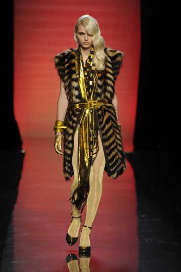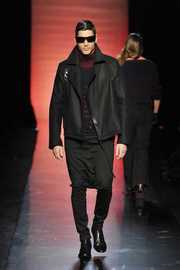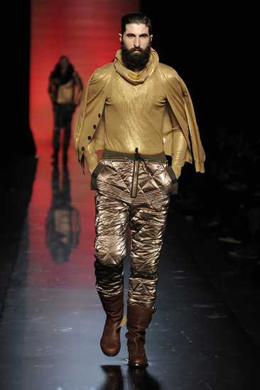 И действительно, зимняя коллекция Жана Поля Готье для шпионов и простых джентльменов, - это вариации на тему cмокинга (например, брюки, превращающиеся в длинную юбку, прикрывающую, правда, только одну ногу, в то время, как на спине наблюдается сложное переплетение татуировок) и мужской юбки-килта, кожаной или с доходящими до колен декоративными полосами.